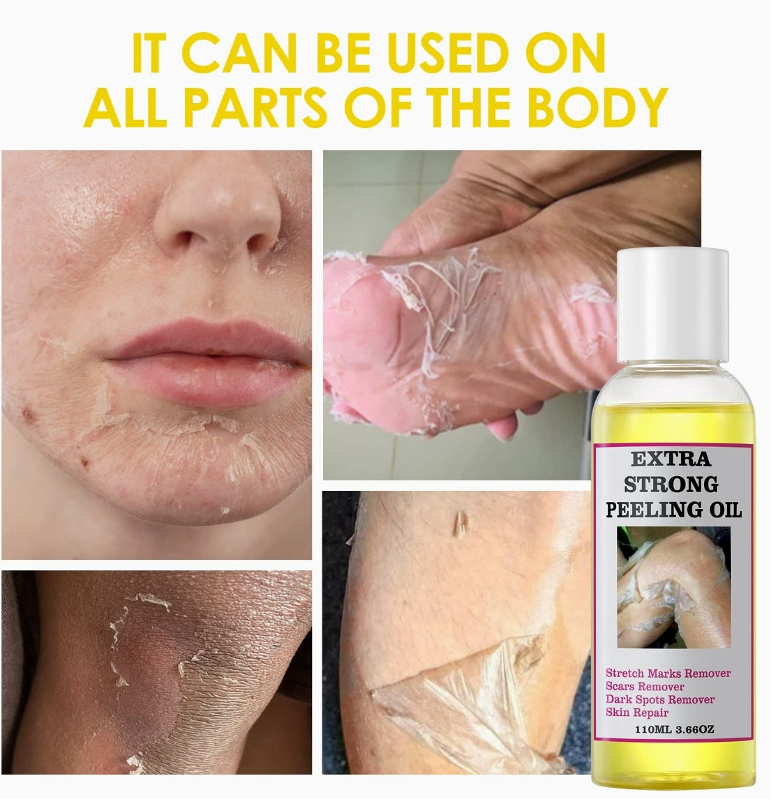 Aceite de pelado para manchas oscuras con fórmula natural: este aceite de pelado amarillo súper fuerte está hecho de salicílico, hialuronato de sodio, extracto de centella asiática, raíz de regaliz Glycyrrrhiza Glabra, extracto de flor de manzanilla Recutita Matricaria y que está diseñado para pelar suavemente la superficie superior de la piel. Limpia y suaviza la piel, exfolia y ayuda a que los poros se vuelvan firmes.