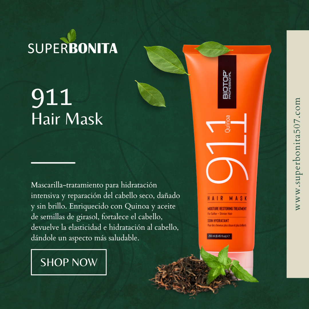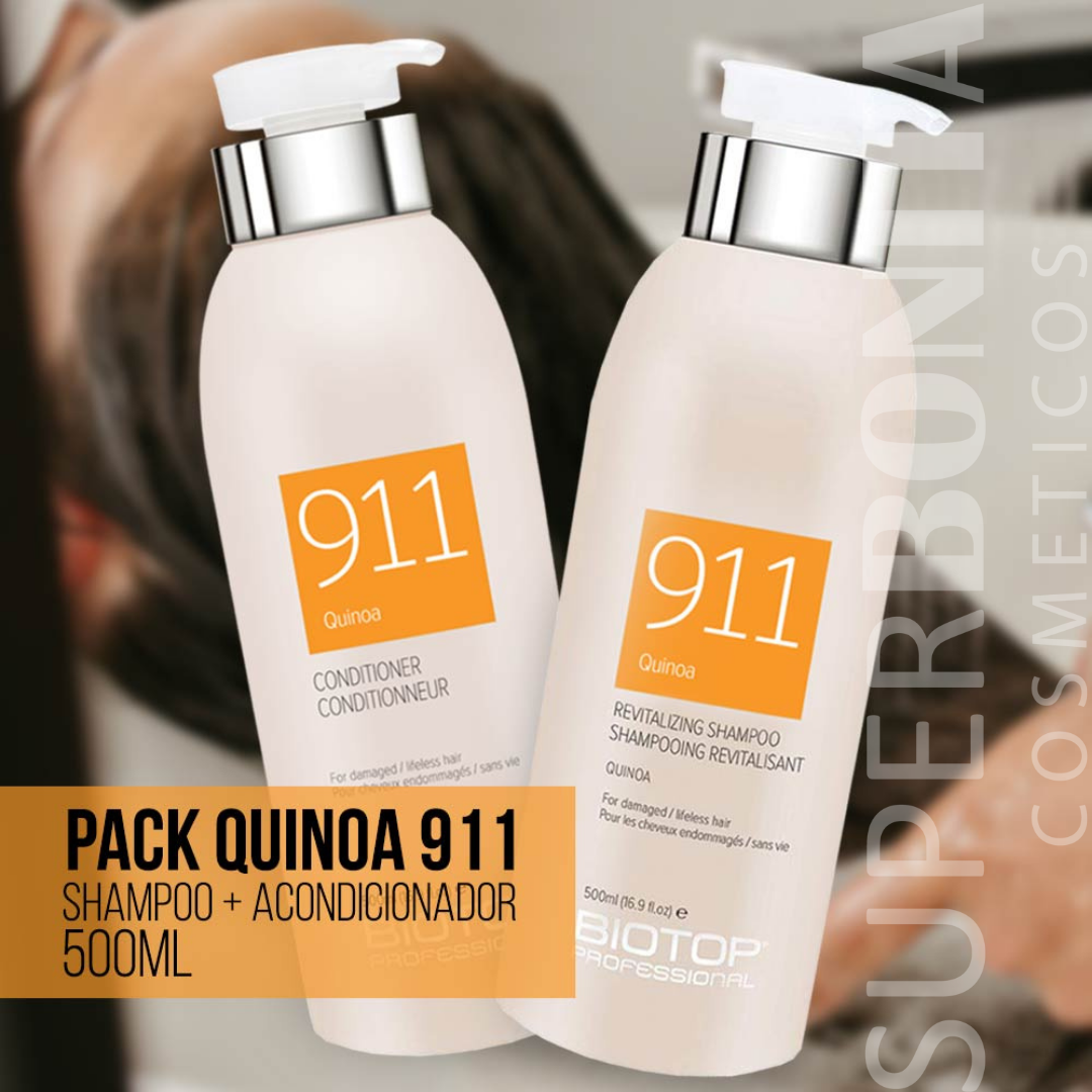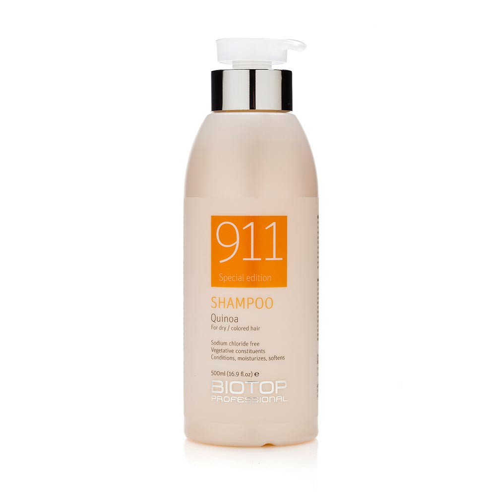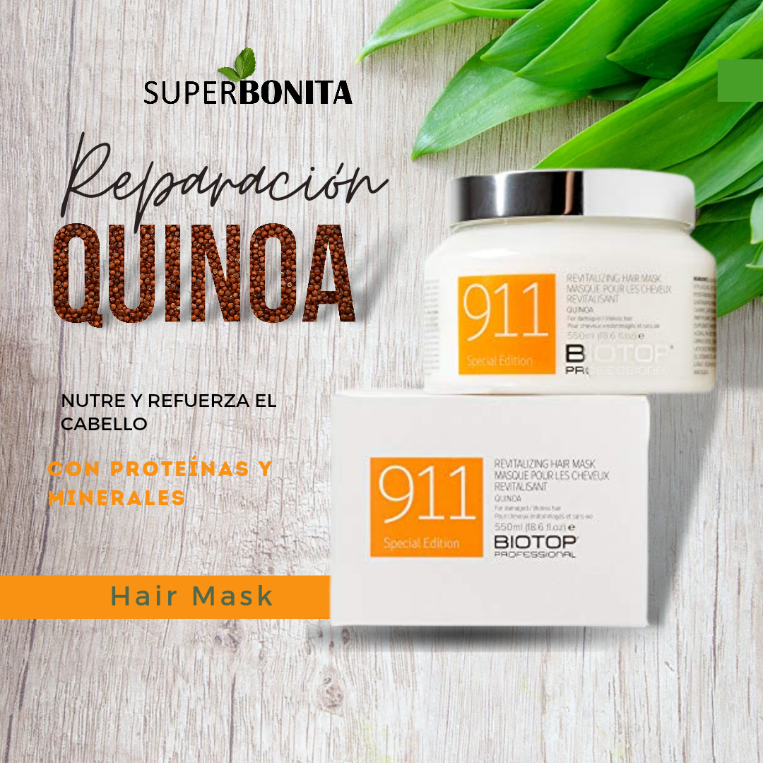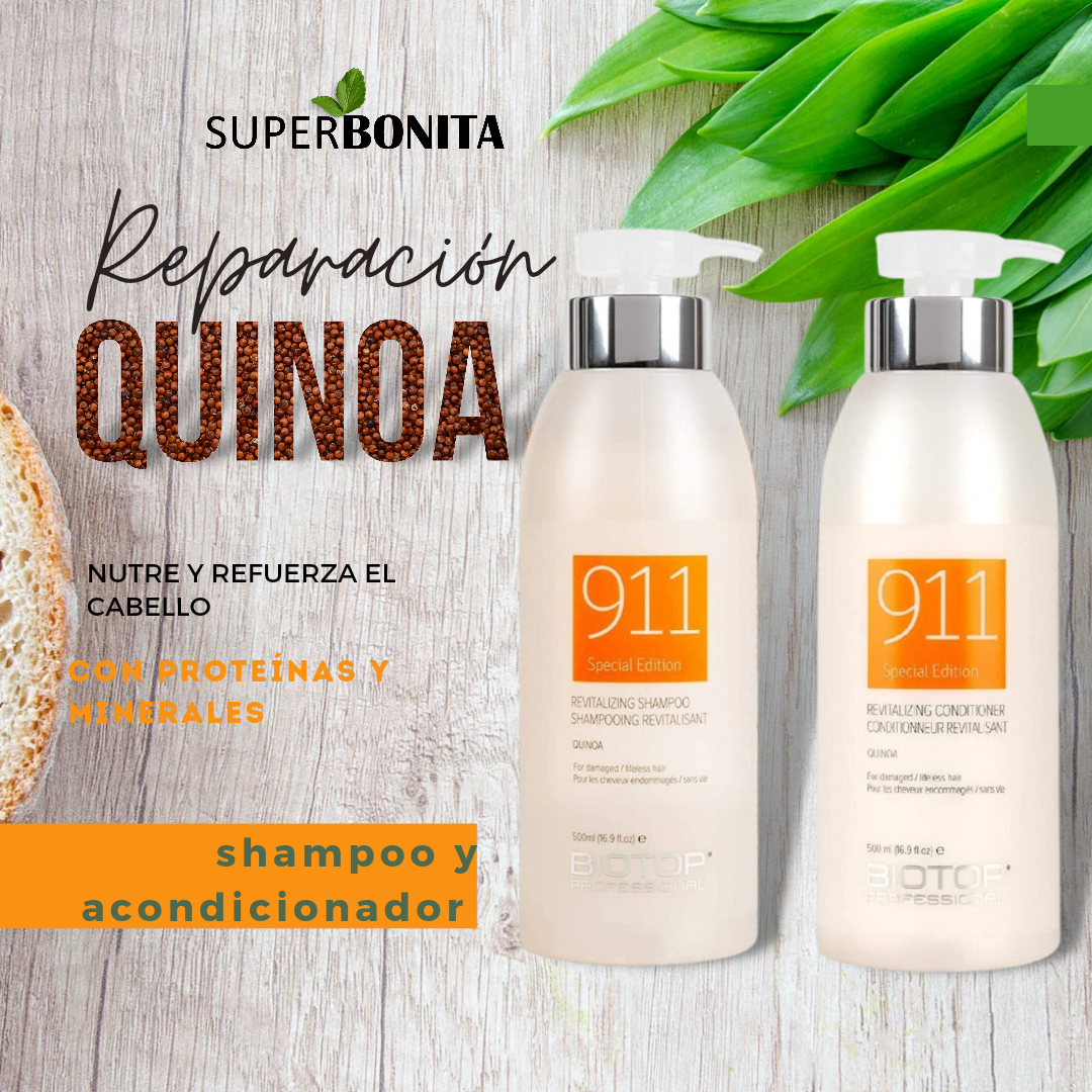La colección 911 Quinoa de Biotop nutre y restaura el cabello desde dentro, dando un impulso energético al cabello seco, dañado y sin vida gracias a extractos de quinua pura 10%. Utilizando extractos de quinua pura, vitamina E, aceites esenciales y agua pura, cada producto de esta serie ha sido especialmente formulado para tratar el cabello seco, dañado o quebradizo. Cada producto protege y fortalece el cabello, dando un brillo impecable y un brillo saludable inmejorable.