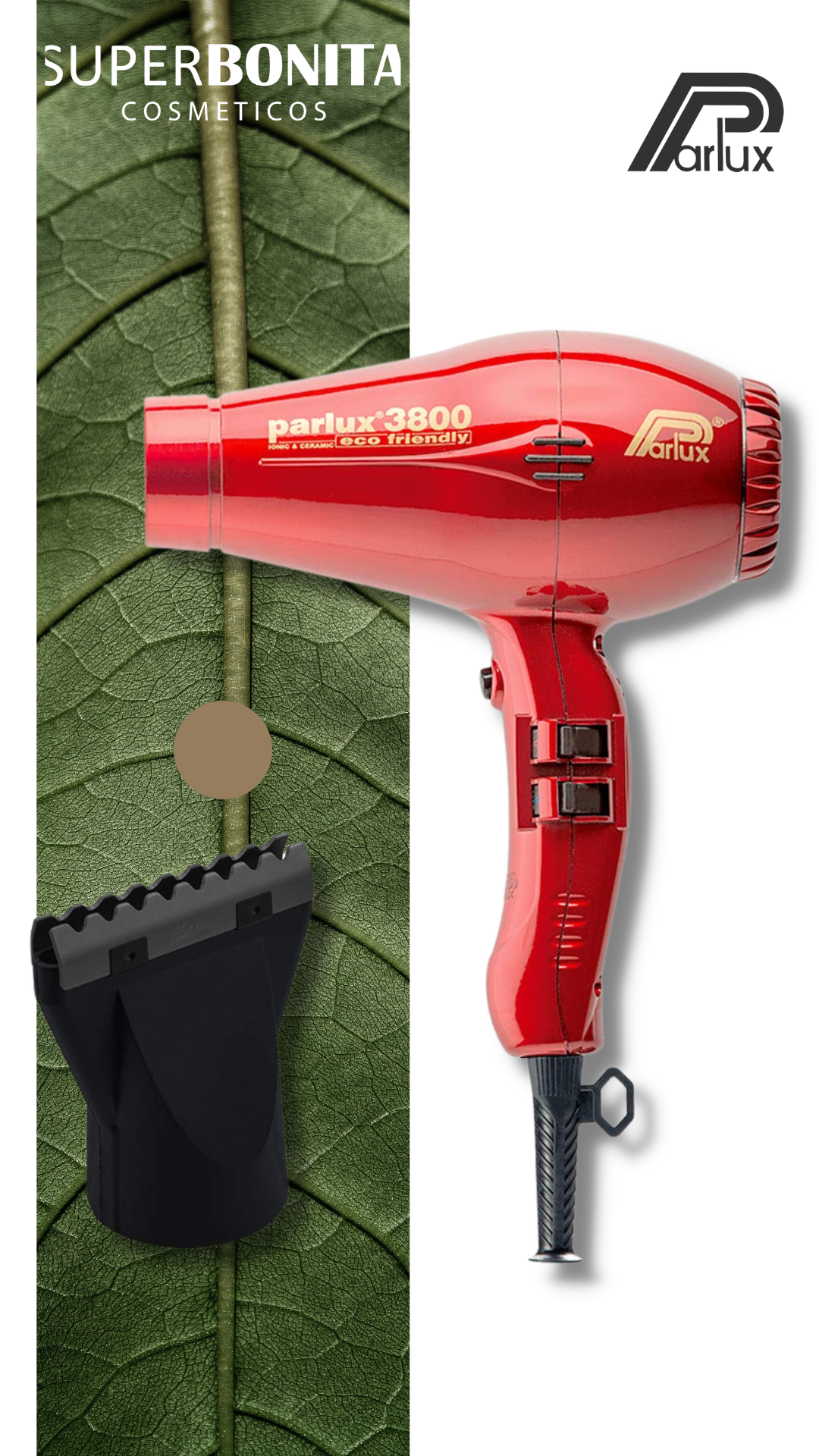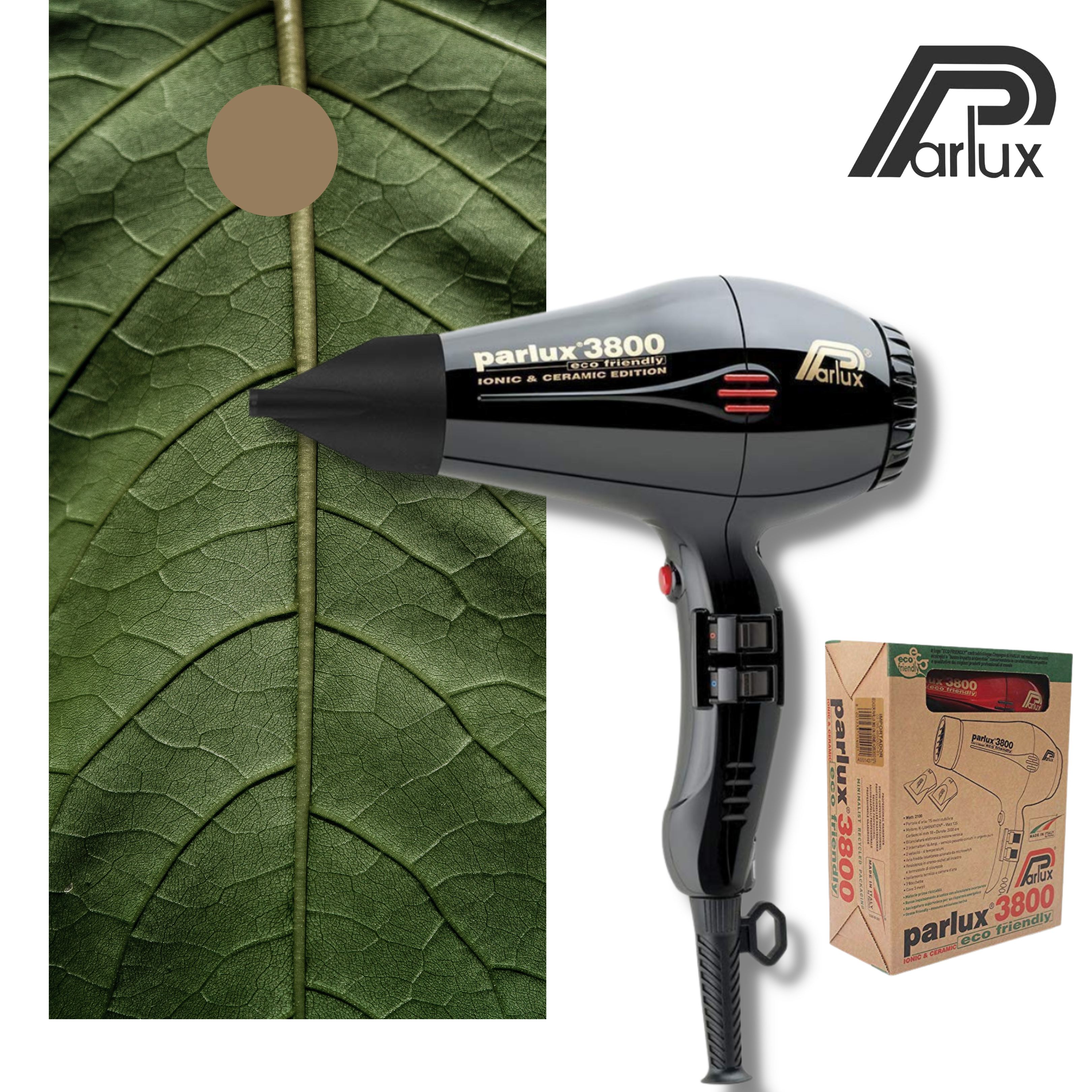Secador de pelo Parlux 3800: ¡"a medida" para la peluquería! Gracias a las numerosas pruebas realizadas a los mejores estilistas, los diseñadores de Parlux han hecho que el dispositivo profesional tenga el tamaño ideal requerido por el profesional exigente. El nuevo secador de pelo Eco Friendly Parlux 3800 incluye un sofisticado silenciador incorporado "pendiente de patente" especialmente diseñado para reducir el ruido, lo que permite al profesional utilizar su secador de pelo durante horas sin molestias tanto para usted como para el cliente.