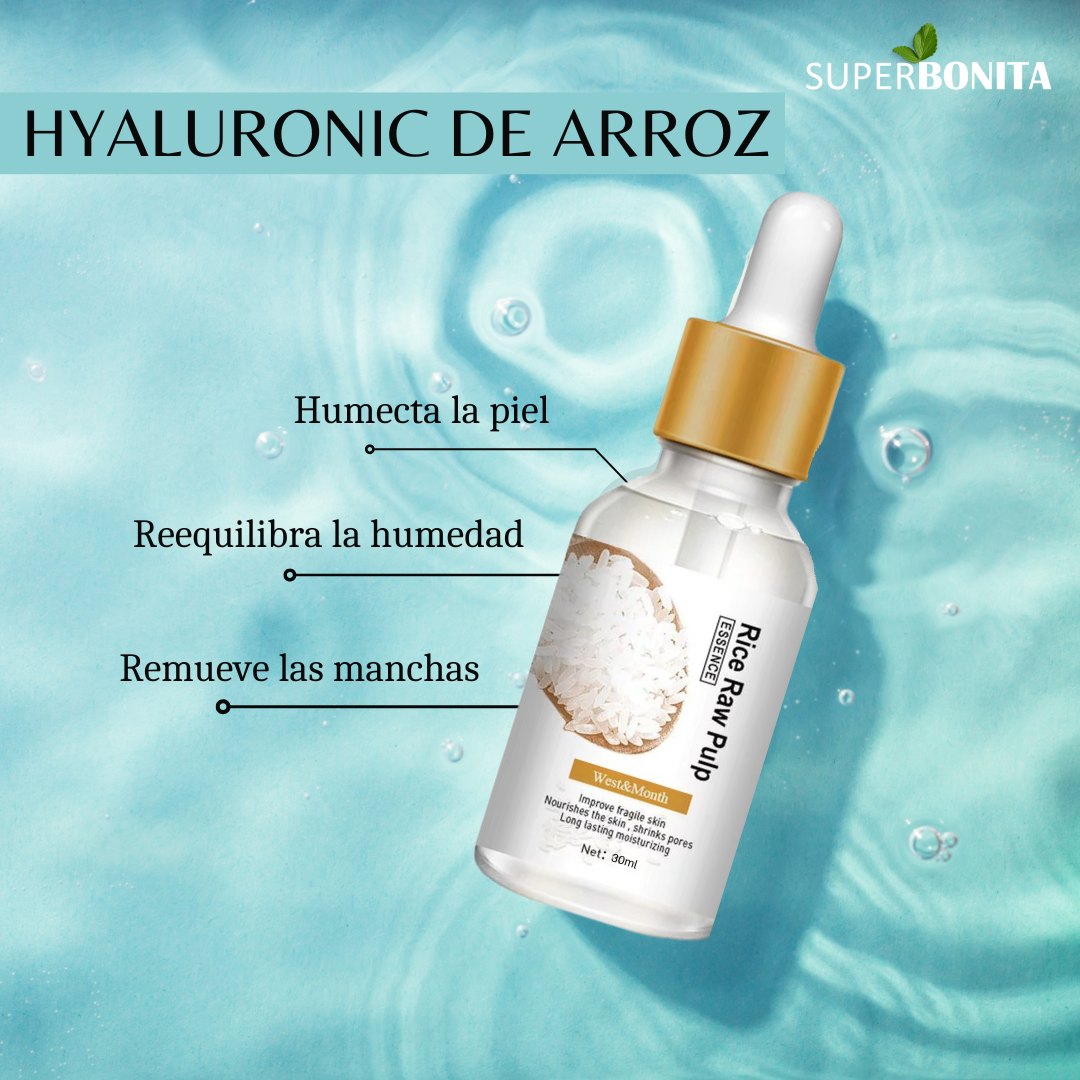 El ácido hialurónico de arroz es un ingrediente clave utilizado en cosmecéuticos por sus propiedades hidratantes y antiarrugas (higroscópicas, reológicas y viscoelásticas). Sin duda, es una forma eficaz de cambiar tu rutina de cuidado de la piel y aportar una gran dosis de hidratación. Éstos son sólo algunos de los beneficios del ácido hialurónico: