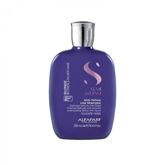 Anti-Yellow Low *Shampoo* limpia delicadamente, neutraliza los reflejos amarillentos no deseados y aporta vitalidad e hidratación al cabello.