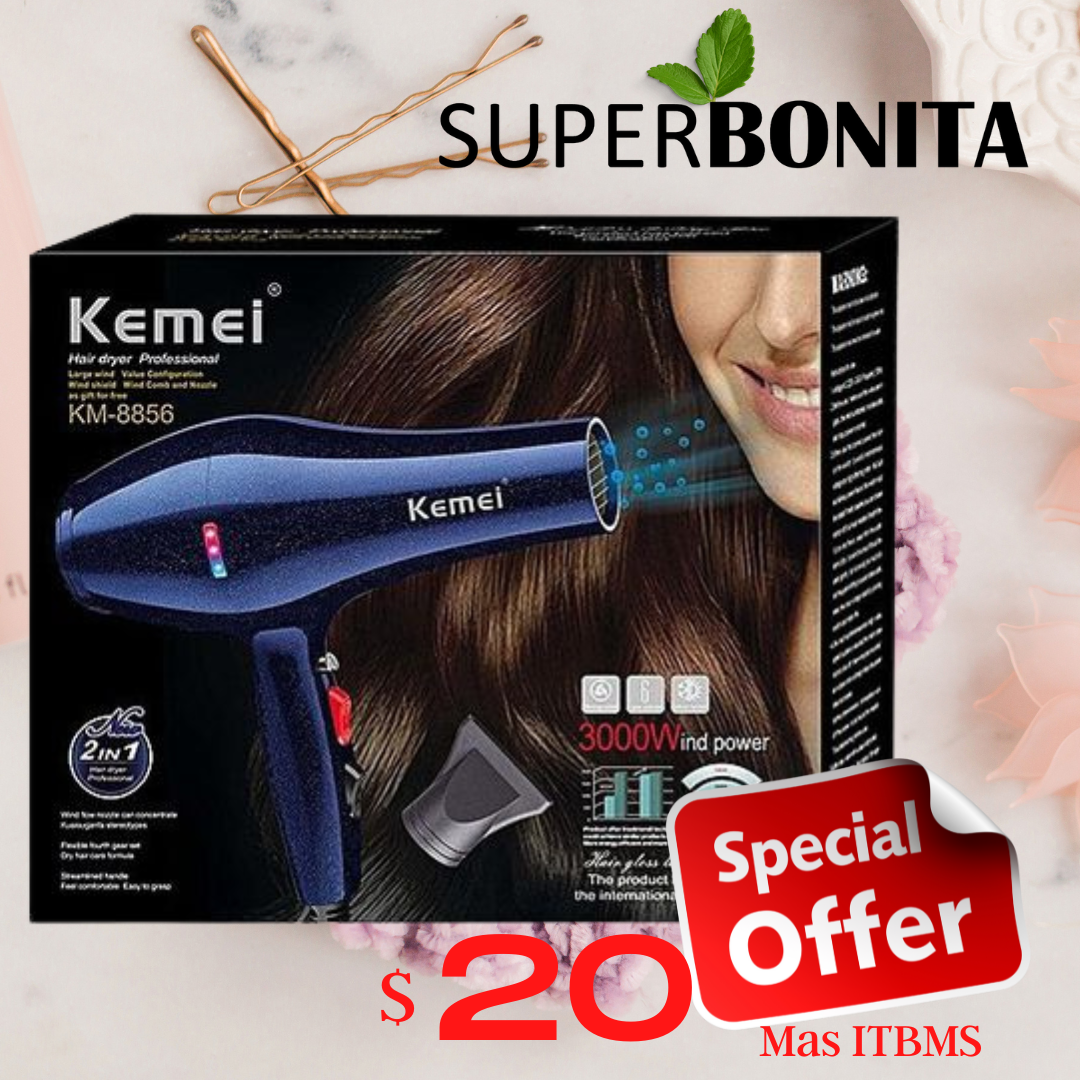 Marca: KemeiModelo: KM-8856Protección contra sobrecalentamiento dobleForma de secado rápidoCuatro aire acondicionado frío y calienteColor: azul oscuroMaterial: ABSTamaño: 23 * 25 cmEquipo: 2 archivosTobera: Conjunto de boquillaPotencia nominal: 2000WVoltaje nominal....